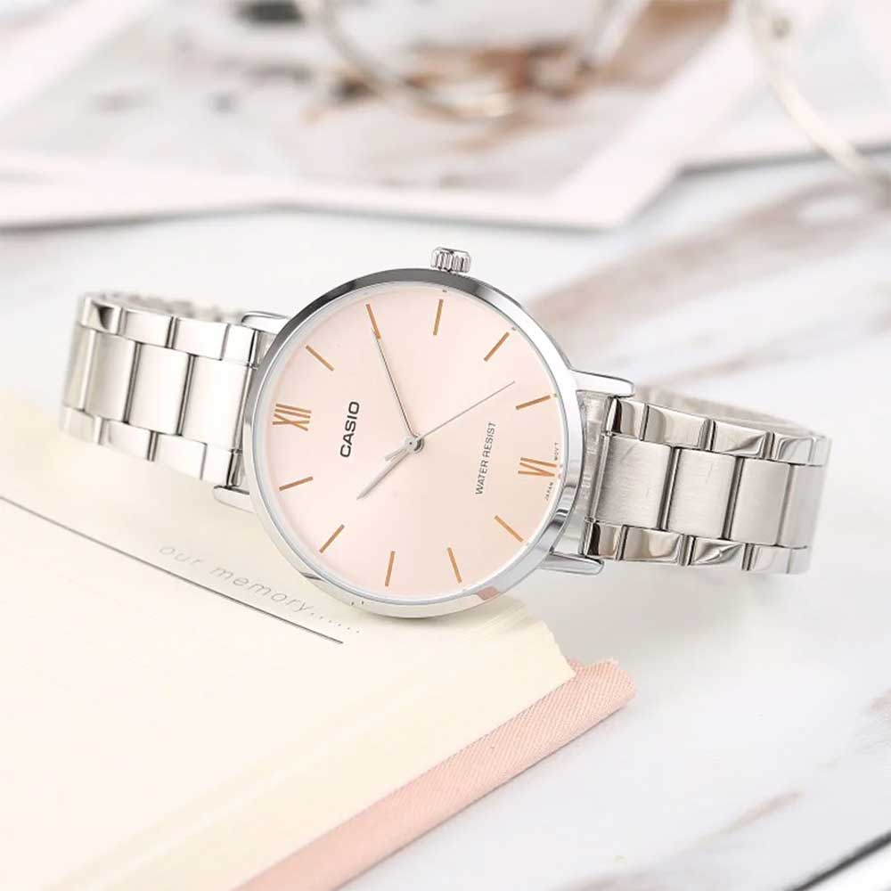 ساعت زنانه کاسیو LTP-VT01D-4B، بند استیل نقره ای با کیفیت، بدنه استیل نقره ای، با قفل کلیپسی ایمن و مقاوم، صفحه صورتی ساده با طراحی ساده و مینیمال، یک انتخاب بی نظیر برای خانم هاست. کاسیو انتخابی محبوب در بین همه سنین و همه سلیقه ها. دارای گارانتی شرکتی می باشد.