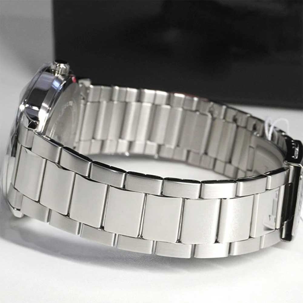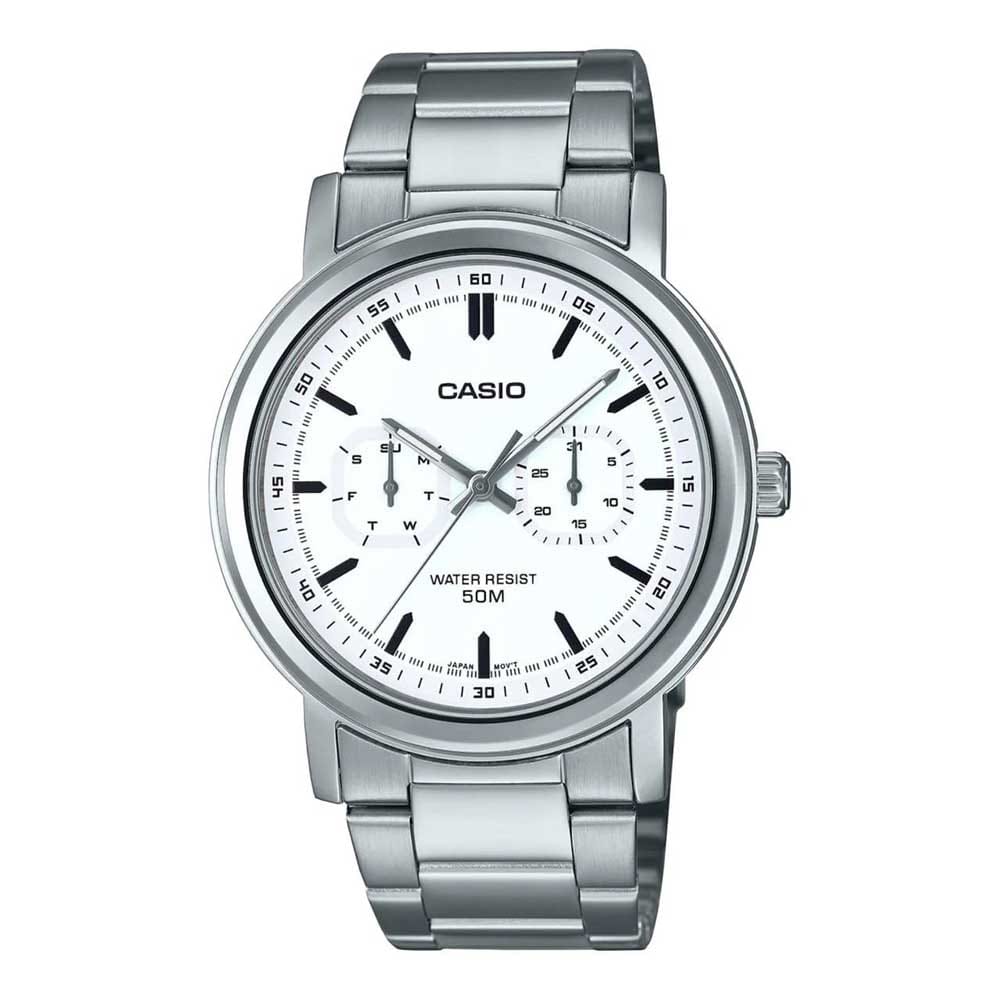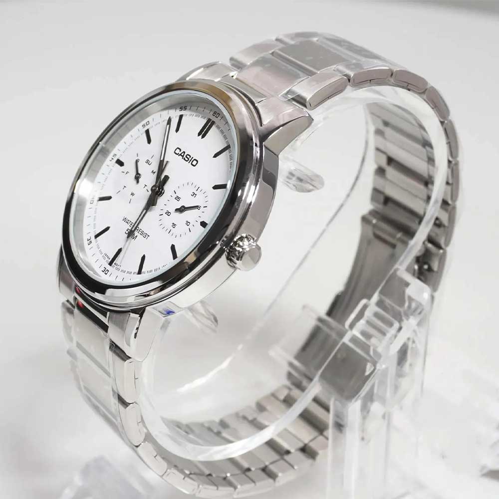 ساعت مردانه کاسیو MTP-E335D-7E، بند استیل نقره ای با کیفیت، بدنه استیل نقره ای، با قفل کلیپسی ایمن و مقاوم، صفحه سفید با نمایشگر تاریخ،روزهای هفته، یک انتخاب بی نظیر برای آقایان است. کاسیو انتخابی محبوب در بین همه سنین و همه سلیقه ها. دارای گارانتی شرکتی می باشد.